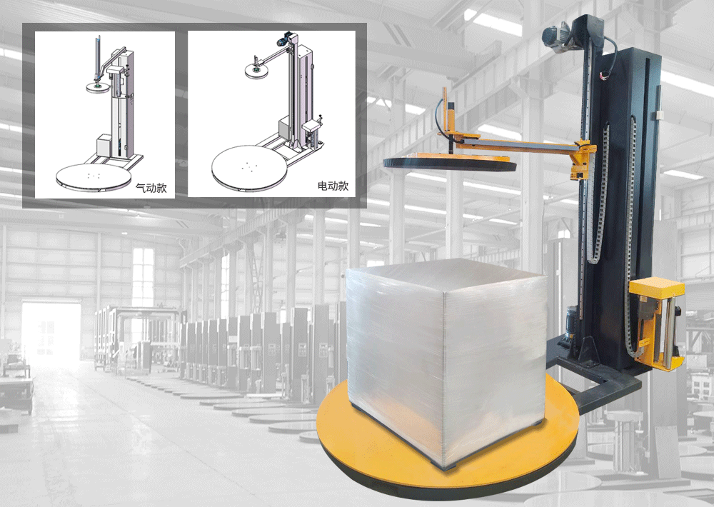 可分為氣動壓頂型托盤纏繞機和電動壓頂型托盤纏繞機